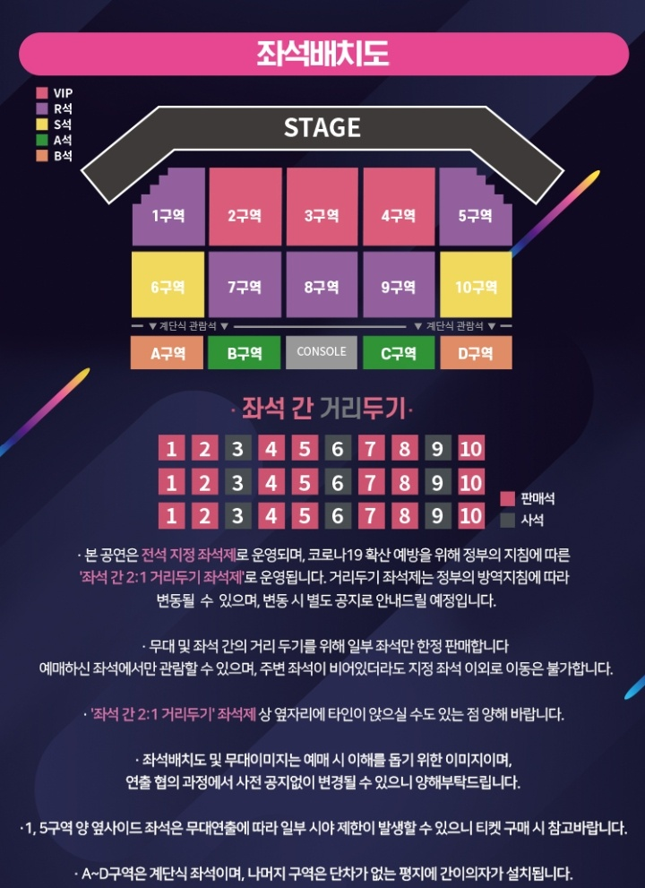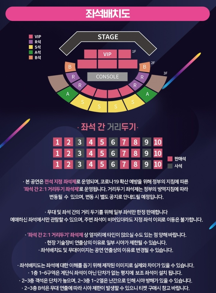 공연은 전석 지정 좌석제로 운영되고 코로나로 인해 좌석간 2:1 거리두기 좌석제로 운영됩니다. 또한 1층 1~6구역의 경우에는 계단식 좌석이 아니며 단차가 없는 평지에 보조좌석이 설치되니 이 점 유의하시길 바랍니다. 2층과 3층의 객석은 단차가 높으며 특히나 2층, 3층의 1~2열은 난간으로 인해 시야방해가 있을 수 있으니 이 점 참고하셔서 예매하시길 바랍니다.